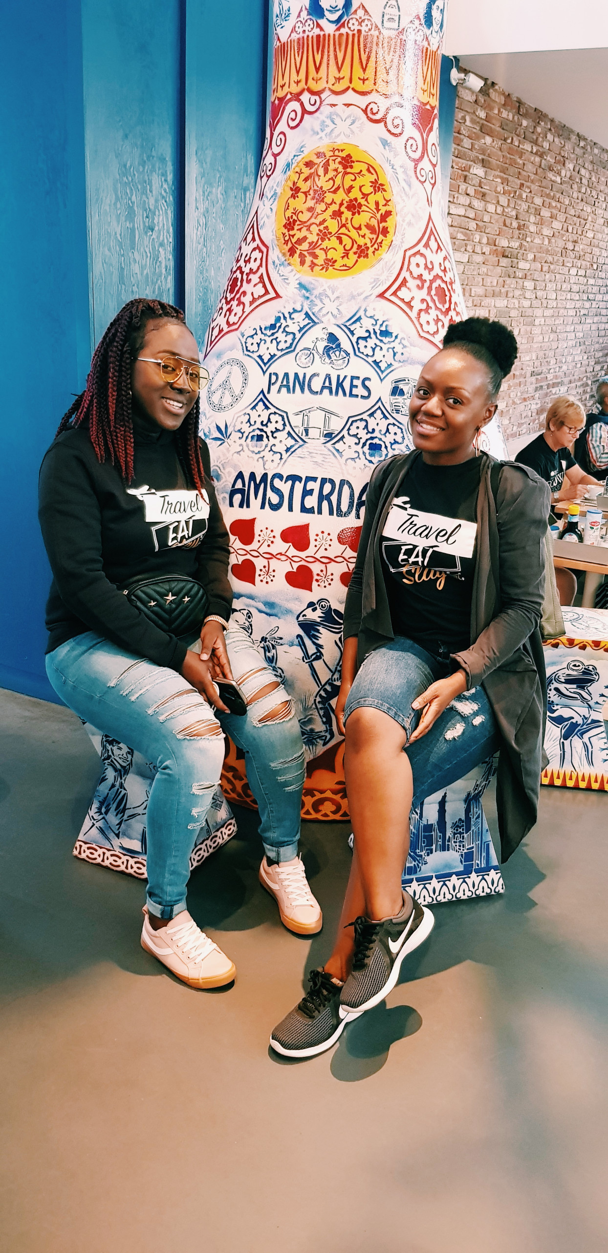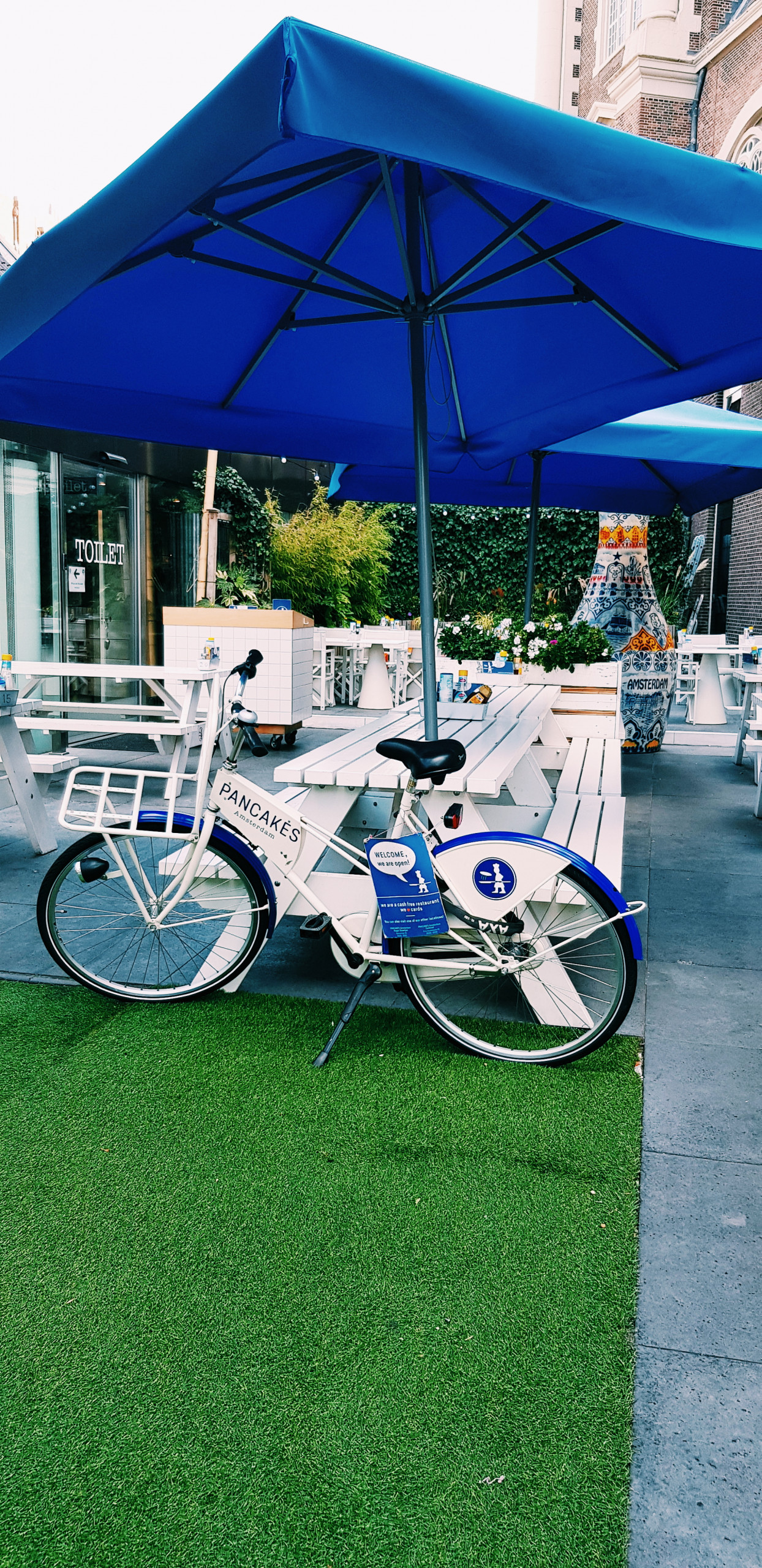 All this sightseeing left us feeling peckish, with the rental bikes returned (a place right opposite Anne Frank Huis) and Pamela’s passport safe in her bag (used as insurance for bike rental) we were on the hunt for some Dutch food.Despite learning that the Anne Frank Huis was closed for the day we settled for a quick “we were here” photo at the front door. Whilst cycling we couldn’t help but notice the various pancake shops around the city we decided to get our fix in Pancakes Amsterdam. Walking into the restaurant you are welcomed by it’s delft blue décor and the sweet and savoury aromas. The menu features many pancake-centric dishes from flat Dutch pancakes to fluffy, thicker American varieties. As a thank you along with the bill we were gifted with a wooden Dutch clogs keyring. What a novel idea!