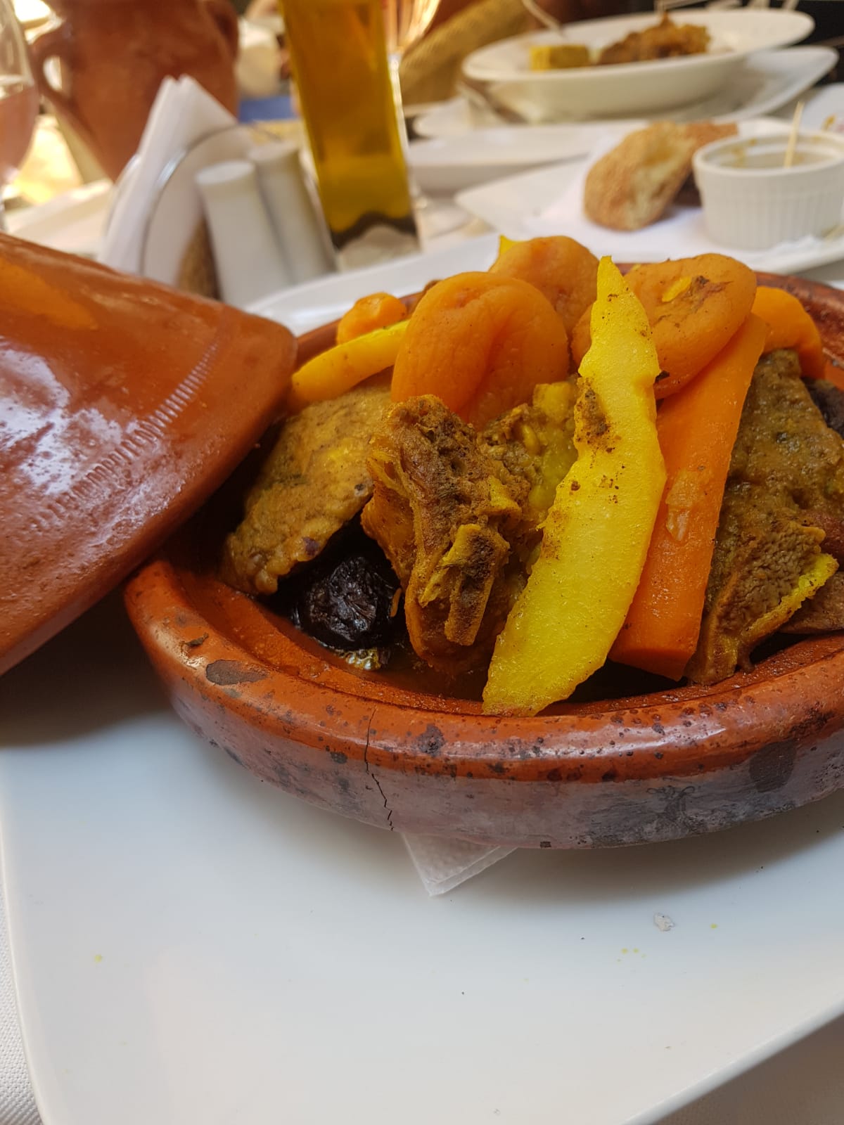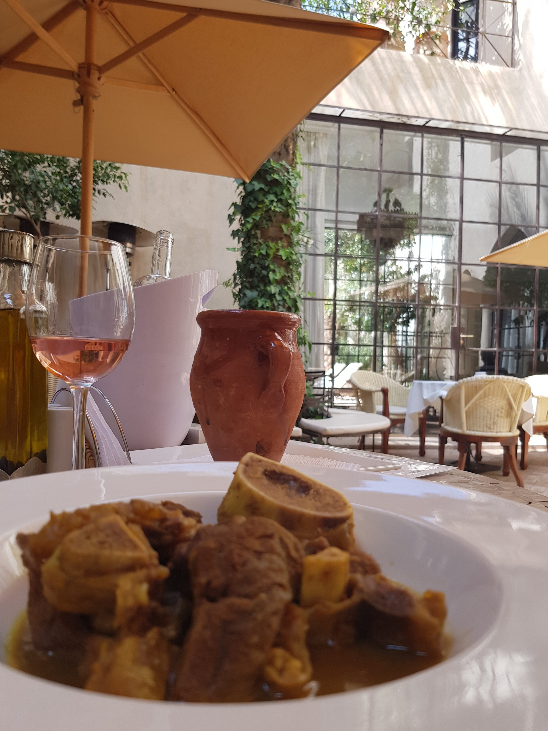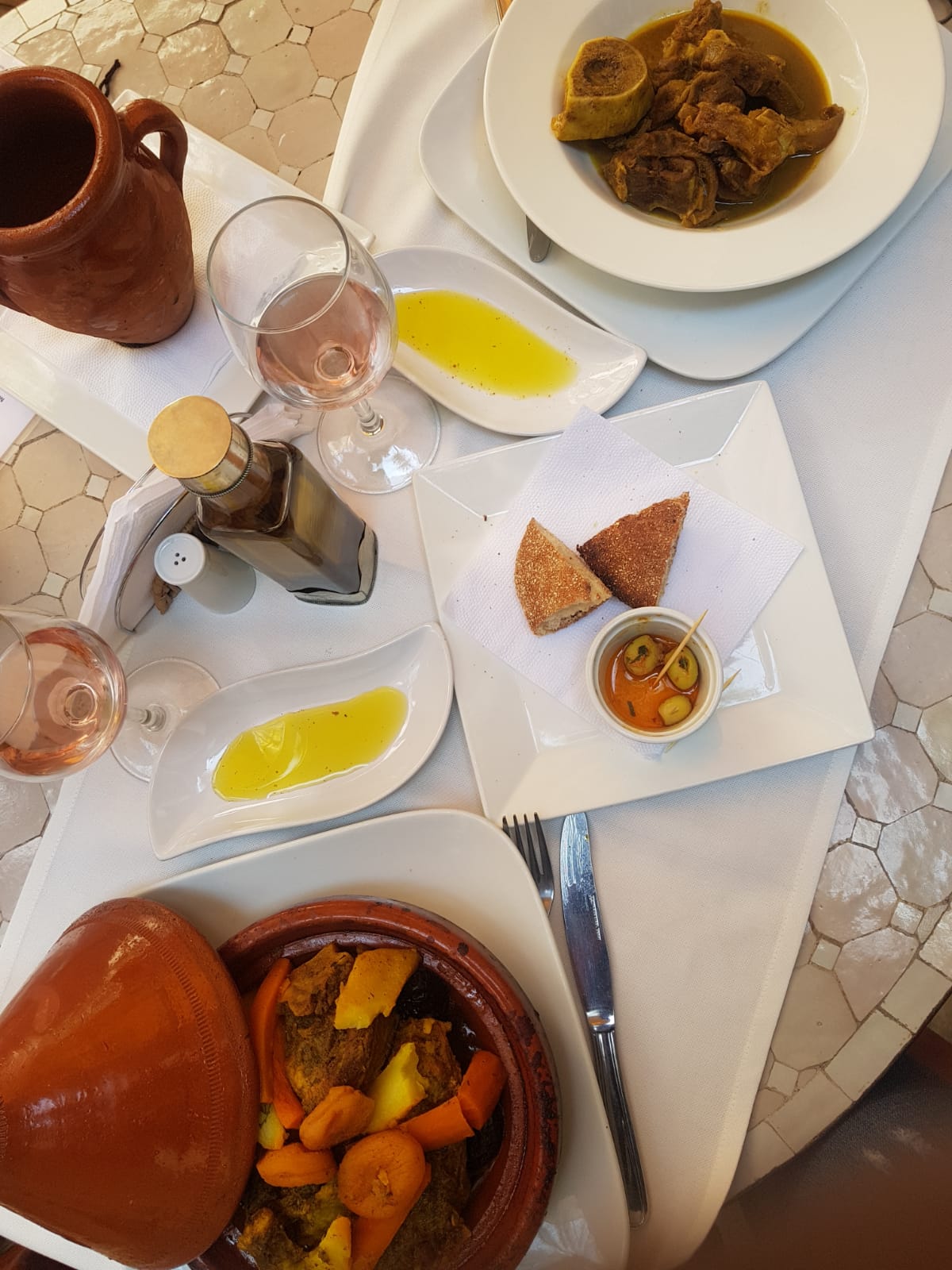 Zen moment over. Feeling refreshed we headed back into the medina in search for food. No matter the hunger, I am never keen on experimenting with street food. We came across Palais Khum Marrakech and decided to give it a try. Despite its-not-so-attractive outward appearance, walking inside we were gobsmacked by how luxurious and spacious the place was. Not only did it offer dining it also included accommodation, spa, and great instaworthy settings. Our lunch (lamb tagine for Coumba and tangier for me) and a bottle of wine came to a total of 580 Dirham (about £47).